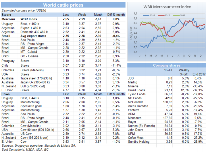 本周南方共同市場(chǎng)閹牛價(jià)格復(fù)蘇,主要原因除了各國(guó)貨幣增值,還包括活牛市場(chǎng)的穩(wěn)定,本周從2.59美金/公斤漲到2.65。本周巴西雷亞爾增值2.7%,阿根廷比索增值3.3%,此外巴西平均牛價(jià)增長(zhǎng)了0.5%到134.1雷亞爾,因此巴西育肥牛價(jià)格漲了7美分到2.35美金,阿根廷本地牛價(jià)保持穩(wěn)定,但貨幣增值導(dǎo)致美金價(jià)漲了9美分至2.63美金。烏拉圭牧場(chǎng)的活牛供應(yīng)非常短缺,由于481配額的原因需求也在增加,所以價(jià)格呈上漲趨勢(shì),巴拉圭活牛價(jià)格本周沒有變化。
