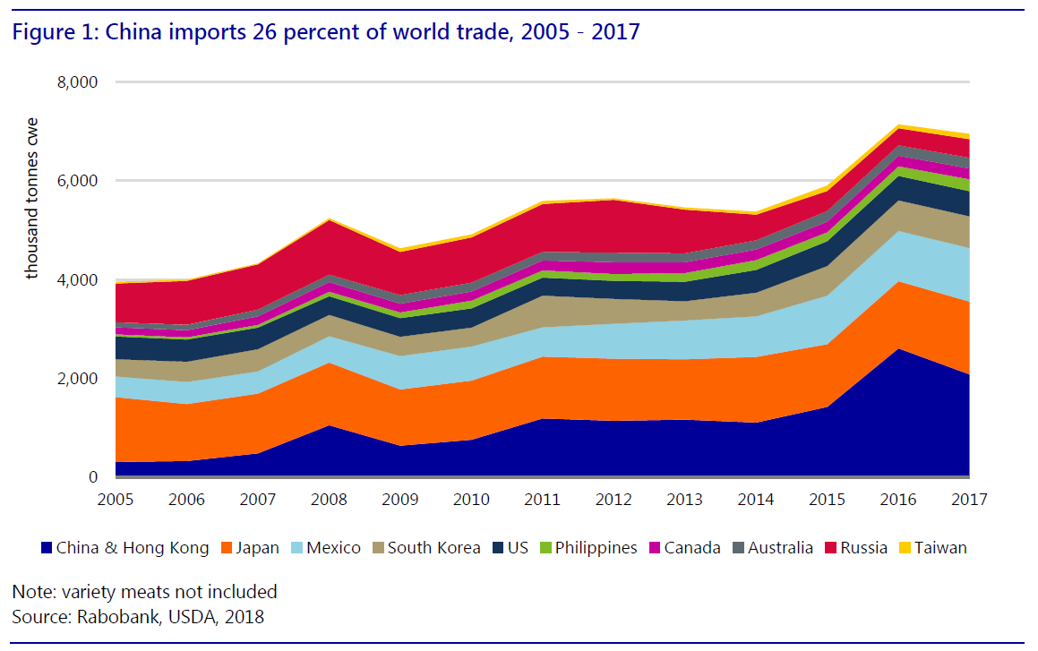 l 中國(guó)已成為豬肉和副產(chǎn)品出口最大對(duì)象國(guó)。其他亞洲國(guó)家的豬肉進(jìn)口需求也在增長(zhǎng)。豬肉進(jìn)口產(chǎn)品除了低貨值種類還包括增值產(chǎn)品。
