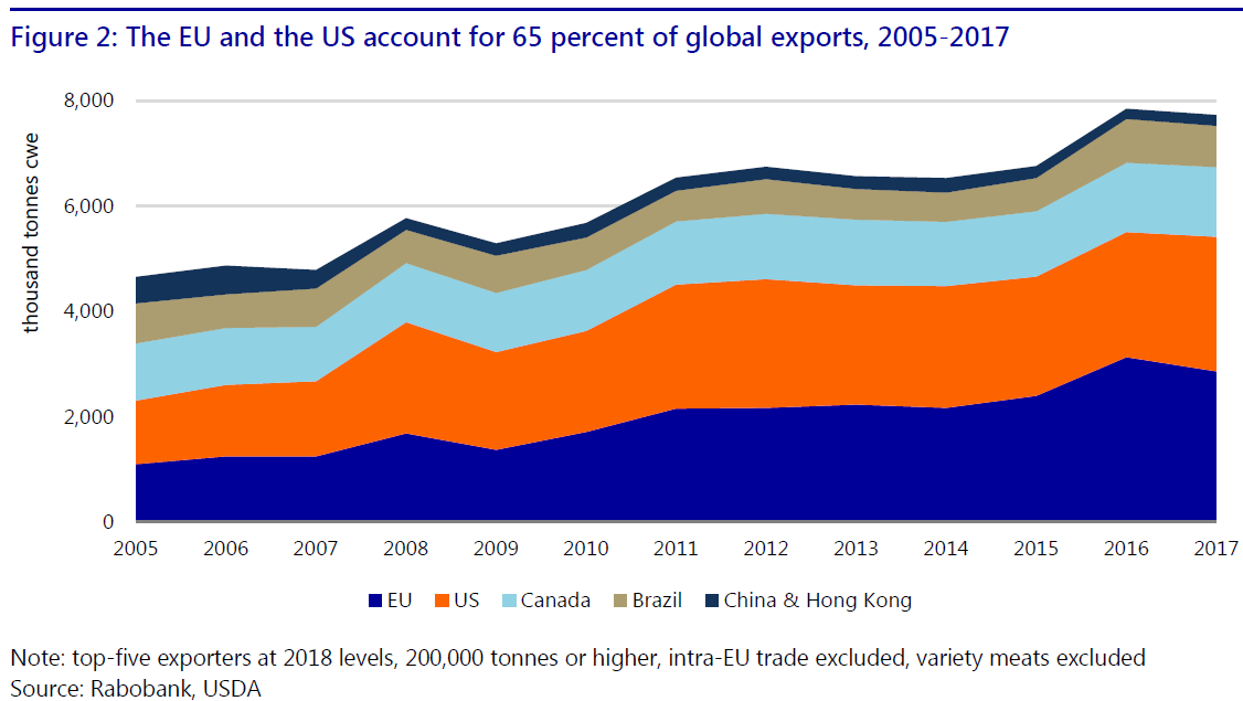 2017年全球豬肉交易830萬(wàn)噸,180億歐元,交易量占17年全球產(chǎn)量的7.5%。歐盟、美國(guó)、加拿大和巴西四大豬肉出口國(guó)出口數(shù)量占全球豬肉出口的91%。自2010年,國(guó)際豬肉交易增長(zhǎng)超過(guò)37%,雖然中國(guó)進(jìn)口需求下降導(dǎo)致17年國(guó)際豬肉交易量略有下降。