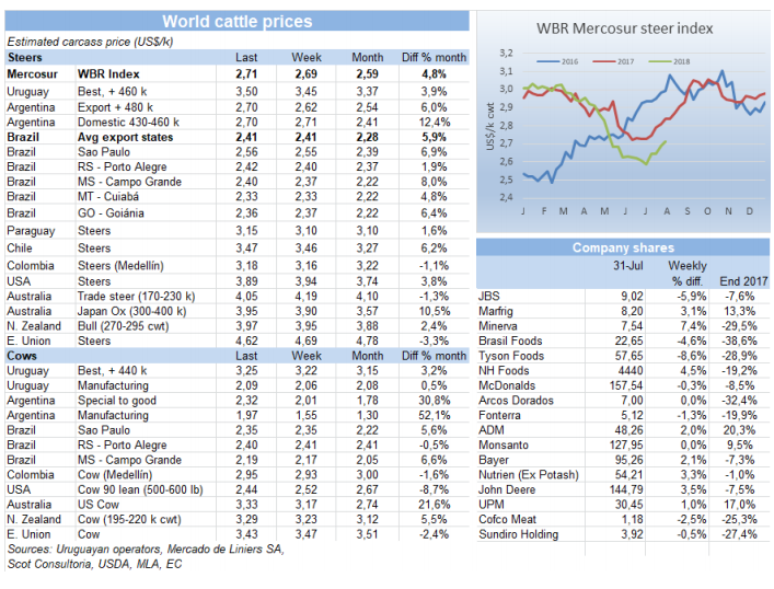 南方共同市場(chǎng)閹牛指數(shù)本周漲了2美分到2.71美金,12周以來最高,本周阿根廷,烏拉圭和巴拉圭牛價(jià)都上漲,巴西保持不變。阿根廷近期牛價(jià)又開始強(qiáng)勁上漲,本周漲了2比索,換算成美金價(jià)漲了8美分至2.7美金,比6月中最低的2.43美金高了很多,巴拉圭和烏拉圭供應(yīng)短缺也促使牛價(jià)上漲。巴西本地牛價(jià)微漲,但被貨幣的小幅貶值抵消了。