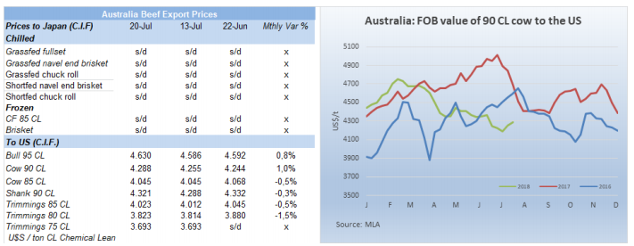 中國(guó)市場(chǎng)沒有活躍的跡象,不確定這一過程會(huì)持續(xù)多久,中國(guó)進(jìn)口商想還跟匯率上漲之前一樣的人民幣價(jià)格,把匯率上漲的成本轉(zhuǎn)嫁給出口商,因此還價(jià)折換成美金非常低,很難成交。比如全牛前報(bào)盤3100,還盤2900,90機(jī)測(cè)牛前報(bào)3900,還3550。美金人民幣匯率從展會(huì)時(shí)的6.3漲到現(xiàn)在的6.9,意味著成本上升了15%,八月對(duì)今年的市場(chǎng)發(fā)展趨勢(shì)非常關(guān)鍵。此外水漂貨走量和價(jià)格也很疲軟,巴西腱子甚至不超過3600。