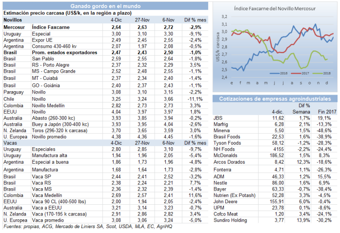 本周南方共同市場閹牛指數還算堅挺,受益于阿根廷和巴西牛價上升,漲了1美分到2.64美金。巴西本地牛價上漲,雷亞爾也有所增值,美金牛價漲了4美分到2.47美金,阿根廷本地牛價穩(wěn)定,比索增值,美金牛價也漲了4美分到2.49美金,烏拉圭和巴拉圭正相反,烏拉圭牛價暴跌10美分到3美金,巴拉圭跌了2美分到3.08美金,因此現在巴拉圭成了該地區(qū)牛價最高的國家。