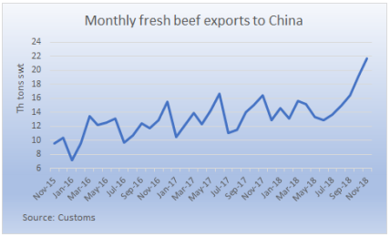 中國十一月從烏拉圭進口超過2萬噸牛肉