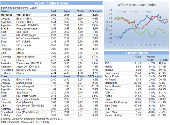 南方共同市場閹牛價(jià)格本周跌了2美分到2.62美金,主要是貨幣疲軟導(dǎo)致。全球的不確定因素對南美地區(qū)貨幣造成了影響,巴西雷亞爾貶值1.9%,阿根廷比索貶值2.4%,雖然巴西本地牛價(jià)漲了1雷亞爾,美金牛價(jià)還是降低了3美分到2.44美金,阿根廷本地牛價(jià)也因?yàn)闅W洲市場低迷而有所下跌,美金牛價(jià)跌了8美分到2.41美金。巴拉圭和烏拉圭牛價(jià)穩(wěn)定在3.08和3美金。