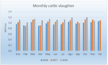 阿根廷十一月總共屠宰108.1萬頭牛,比十月少9%,不過算前十一個(gè)月的話,總共屠宰1221.6萬頭,比2017年多7%,產(chǎn)能最大的13廠十一月屠宰量下降很多,被1920廠超過只能排第二,三至五名分別是2025,2082和COTO。
