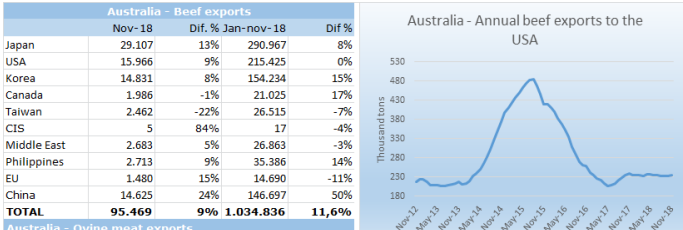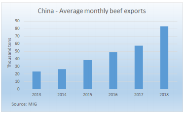 近十二個(gè)月牛肉出口總值達(dá)到16億美金,如果算上副產(chǎn)品和成品,總值達(dá)到19.4億美金,比2017年高4%,出口總量方面跟2017年相差不多,大約45萬噸。