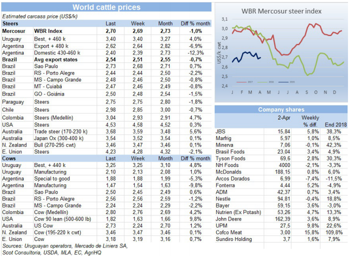 第一季度烏拉圭對歐盟出口了9535噸冷鮮牛肉,同比增長1%,因?yàn)橄栴D配額價(jià)格下跌,平均離岸價(jià)跌了4%到9367美金,而冷凍牛肉市場反應(yīng)冷淡,三月出口817噸,第一季度2877噸,同比減少42%,離岸均價(jià)6532美金,同比下跌11%。烏拉圭18/19農(nóng)業(yè)年希爾頓和481配額出口量都有所下降,截止到3月22日,希爾頓配額出口量4905噸,同比減少5.5%,481配額出口9961噸,同比減少13.5%,希爾頓配額離岸均價(jià)跌了9.8%到10628美元,而481配額均價(jià)跌了2.9%到9417美元。