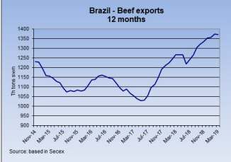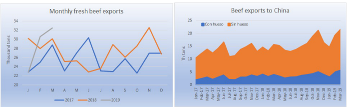預(yù)計(jì)2019年阿根廷活牛存欄量會保持在5380萬頭,能繁母牛預(yù)計(jì)2360萬頭,比2018年略低,母牛屠宰量由于中國出價(jià)高而增加,新生牛犢數(shù)量將減少30萬頭。19年屠宰量將達(dá)到1330萬頭,比去年略低,如果由于飼草生長良好育肥牛壓欄,飼育場會推遲出售給屠宰廠。今年牛肉產(chǎn)量預(yù)計(jì)會達(dá)到300萬噸,與18年持平,待宰牛均重增加。由于阿根廷比索貶值帶來的利好,牛肉出口量預(yù)計(jì)會達(dá)到58.5萬噸,比18年多7.7萬噸(15%),比17年翻倍,從18年8月到19年1月,65%的牛肉出口去到中國和香港,10%去俄羅斯,10%去歐盟,5%去智利。