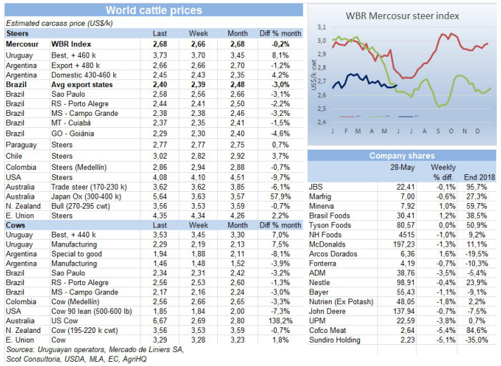 南方共同市場閹牛價(jià)格上漲2美分到2.68美金/公斤,巴西雷亞爾增值抵消了本地牛價(jià)的下跌,美金牛價(jià)漲了1美分到2.4美金,烏拉圭牛價(jià)持續(xù)上漲,目前已經(jīng)比其他國家高出1美金/公斤,阿根廷和巴拉圭牛價(jià)保持不變。