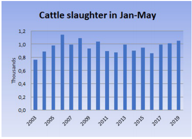 跟去年同期類似,雖然牛只存欄結(jié)構(gòu)預(yù)示屠宰量會(huì)下降,但實(shí)際情況正相反,需求量過大,價(jià)格很有吸引力,刺激農(nóng)牧場出欄,本周牛只屠宰量比前一周減少了2000頭,但同比還是增加3000頭,第一季度屠宰量同比減少3.5萬頭,但四五月屠宰量同比上升,截止到本周末今年共屠宰了近100萬頭,比2018年同期高了差不多2萬頭,五月屠宰量預(yù)計(jì)在22萬頭上下,遠(yuǎn)高于去年五月的18.1萬頭。和2018年一樣,雖然育肥閹牛存欄量較低,但預(yù)期的屠宰量大幅減少這一情況并沒有發(fā)生,截止到5月25日這周共屠宰49291頭牛,其中閹牛是主要品類,達(dá)到25236頭,因?yàn)橥涝讏鲈跒?span lang="EN-US">7月1日開始的新481配額做屠宰。