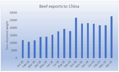 2019年初澳洲活牛出口非?;钴S,共出口35.4萬頭,同比增長14%,不過四月種牛和待宰牛出口量低于去年同期。