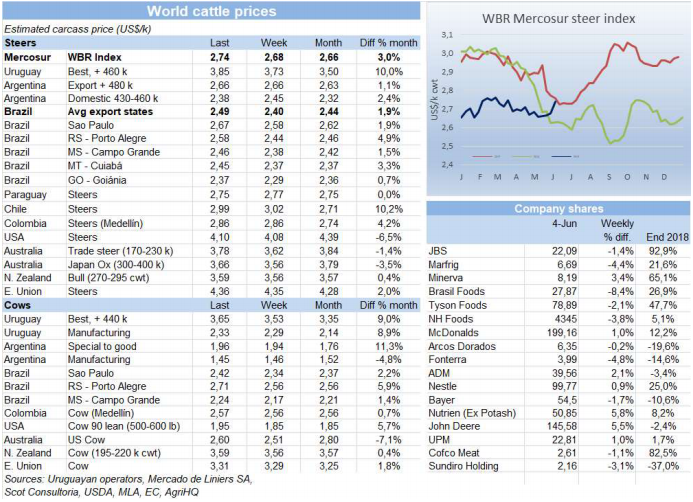 南方共同市場閹牛價(jià)格上漲6美分到2.74美金/公斤,三月中以來最高,主要驅(qū)動力來自巴西雷亞爾,雖然對經(jīng)濟(jì)增長減速有所擔(dān)憂,本周還是增值3.5%,主要出口州牛價(jià)只上漲了0.3雷亞爾/15公斤,到141雷亞爾,但換算成美金牛價(jià)上漲了9美分到2.49美金。烏拉圭活牛市場還是過熱,閹牛價(jià)格本周再度上漲12美分,比其他國家都高了1美元/公斤以上。阿根廷和巴拉圭牛價(jià)沒有變化。