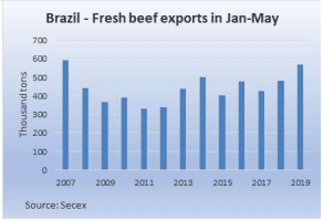 巴西牛肉出口量還在穩(wěn)步增加,由于全球?qū)游锏鞍仔枨笤鲩L,五月牛肉、豬肉以及禽肉出口量都有增加,五月牛肉出口量達(dá)到12.1萬噸,同比增加34%,均價(jià)3883美金,同比降低7.1%。前五個月巴西共出口56.7萬噸,均價(jià)3780美金,出口量同比增加18.2%,均價(jià)下跌7.4%。五月豬肉出口量5.81萬噸,2017年八月以來最高。