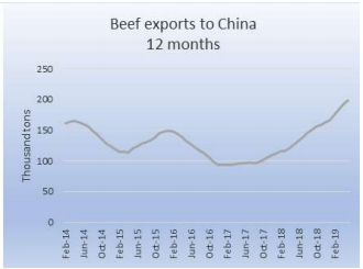 截止到五月的十二個月內(nèi)澳洲共對中國出口19.9萬噸牛肉,同比兩年前的9.6萬噸翻倍還多。對中國出口穩(wěn)步增長,五月中國是澳洲牛肉第三大主要出口市場,共進(jìn)口2.3萬噸,僅比美國少355噸,日本還是最大市場,進(jìn)口2.68萬噸。五月澳洲共出口10.55萬噸牛肉,同比減少4200噸,截止五月澳洲共出口46.9萬噸,同比增加8%。