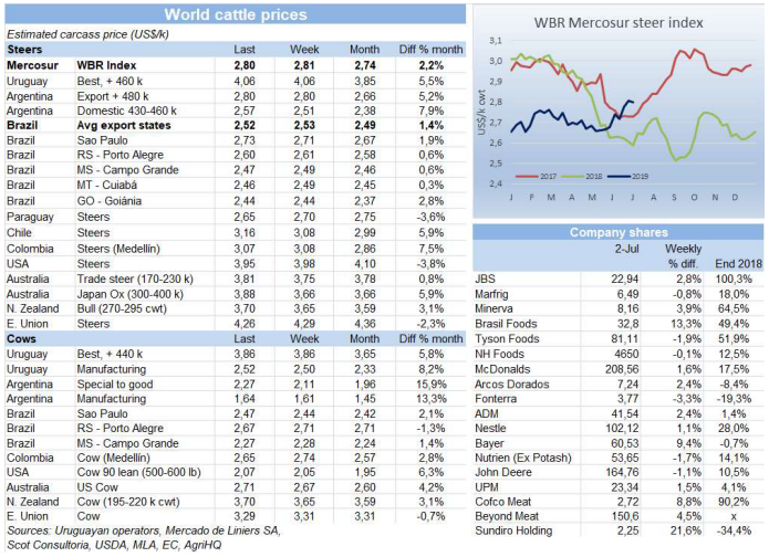 由于巴拉圭價格疲軟,以及雷亞爾貶值,南方共同市場閹牛價格本周降低了1美分到2.80美金/公斤。巴西雷亞爾貶值0.5%,本地牛價的上漲并不足夠抵消貨幣貶值的影響,美金牛價下跌了1美分到2.52美金,巴拉圭供過于求,牛價持續(xù)下跌,本周跌到2.65美金,阿根廷牛價穩(wěn)定在2.80美金,烏拉圭牛價還是遠高于其他國家,但已經(jīng)停止上漲,特種閹牛價格4.06美金/公斤。
