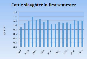 前幾周大雨泛濫導(dǎo)致屠宰量減少,本周有所恢復(fù),截止到6月29日這周共屠宰35712頭牛,比前一周多2902頭,但同比減少了11%,屠宰量的恢復(fù)主要發(fā)生在母牛,母牛屠宰量15049頭,比前一周多3717頭,即33%,而閹牛和小母牛屠宰量都減少了500多頭。6月總共只有157135頭牛被屠宰,同比減少近2.9萬頭,四月和五月的高屠宰量節(jié)奏已經(jīng)結(jié)束。2019年上半年總共屠宰120.2萬頭,和前兩年幾乎一樣。