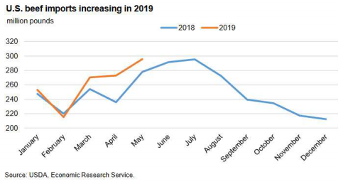 根據(jù)USDA最新預(yù)測,明年美國牛肉和豬肉進口量會減少,羊肉進口量保持不變,大洋洲由于天氣原因存欄減少,牛肉供應(yīng)量持續(xù)減少,預(yù)計美國牛肉進口量會減少3%,由于中國市場非洲豬瘟導(dǎo)致的高需求,以及全球豬肉供應(yīng)減少,美國豬肉進口量預(yù)計會減少4%,美國國內(nèi)牛肉和豬肉產(chǎn)量分別會提高1.1%和2.8%,也減少了對進口肉的需求。2019年美國牛肉進口量增加,五月進口量達到2.96億磅,同比增加6%,除了新西蘭外其他國家對美國出口量都增加,其中澳洲前五個月出口量同比增加14%,主要因為今年上半年澳洲屠宰量增加。