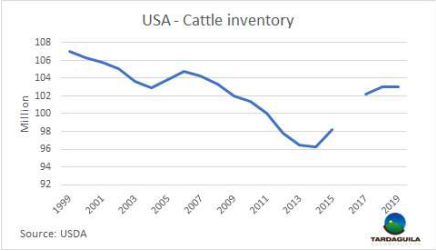 7月1日所有活牛和牛犢存欄量1.03億頭,和去年同期相同,年中牛犢存欄3630萬頭,上半年共出生2650萬頭小牛犢,下半年預(yù)計會出生980萬頭小牛犢。所有母牛和小母牛存欄4170萬頭,其中肉母牛3240萬頭,母奶牛930萬頭。