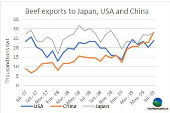 中食展期間的高需求量以及價(jià)格反映在了烏拉圭過(guò)去兩月的出口價(jià)格上,前四個(gè)月出口均價(jià)換算為胴體重量為3727美金/噸,而六七月均價(jià)達(dá)到4110美金,增長(zhǎng)10%。另外中國(guó)市場(chǎng)進(jìn)口量占牛肉產(chǎn)量比例增長(zhǎng),前四個(gè)月占比52%,而六七月是59%。