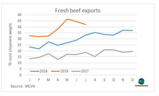七月冷鮮和冷凍的牛肉和牛肉產(chǎn)品出口總量達42016噸,價值23230萬美元。與2018年7月相比出口量增長了26.8%,出口額增長了33%。出口額大幅增長是因為2019年七月平均出口價格比2018年7月增長了4.9%,冷凍無骨牛肉價格增長了14.6%,增長到4900美元/噸,冷鮮無骨牛肉價格同比增長3.1%,增長到8500美元/噸。