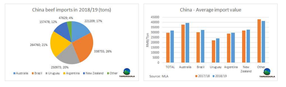 2018/19財年中國平均牛肉進口價格31684元/噸,比2017/18財年增長了7%,按美元計,約4600美元/噸。主要出口商均提高了出口中國的價格,巴西和烏拉圭提價最多,約8%,巴拉圭仍然保持較低的平均出口價格(23999元/噸,約3488元/噸),或許因為價值較低的帶骨牛肉占比較大。提價最少的是阿根廷,約提價2%。澳大利亞也出口帶骨牛肉,比烏拉圭出口量少,澳大利亞出口中國的冷凍牛肉中帶骨牛肉占比11%,烏拉圭帶骨牛肉占比25%。出口中國平均價格最高的是澳大利亞,新西蘭位居其次。2018/19財年,巴西雖然授權(quán)的工廠數(shù)量很少,卻是中國冷鮮牛肉的主要供應(yīng)國,中國從巴西進口鮮牛肉33.9萬噸,占進口總量的26%,排在后面的是阿根廷(21%),烏拉圭(20%),澳大利亞(17%),新西蘭(12%)2018/19財年中國總進口量128萬噸,年增長55%。