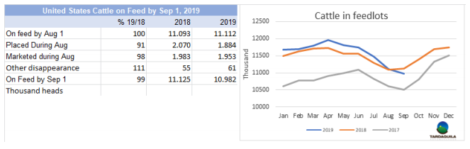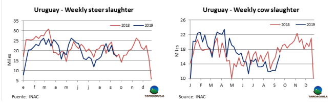 (3998頭),Las Piedras (3644頭),NH-BPU(3637)。Marfrig三家工廠(chǎng)共屠宰9519頭,Minerva兩廠(chǎng)共屠宰7513頭。9月截止目前,共屠宰122334頭牛,比去年同期減少7.3%,預(yù)計(jì)本月屠宰量將近17萬(wàn)頭,比2018年9月減少1萬(wàn)頭,年屠宰量的差距將縮小,過(guò)去三個(gè)月屠宰量減少1.9萬(wàn)-2.9萬(wàn)頭。