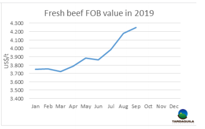 八月牛肉出口總量53293噸(凈出口量),出口額2.905億美元,是2005年以來最大月出口額。比2018年8月出口量增長51.2%,出口額增長64.5%,出口額的增長比出口量大是由于價格上漲了8.8%。今年前八個月,牛肉出口總量為321769噸,比2018年同期增長45.2%,總出口額17.11億美元,同比增長40.5%。