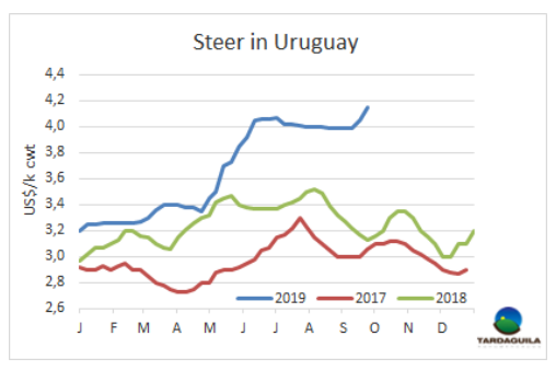 烏拉圭育成牛和后備牛價格仍反映出供應短缺的問題,需求端為采購施加壓力。工廠繼續(xù)以高價在國外市場成交,尤其是中國。這促使工廠收購一切可用的牛。燕麥和苜蓿田的草料產(chǎn)量尚未達到預期,因為三月處于干旱季節(jié),隨后是降雨和洪水,嚴峻的霜凍使草料產(chǎn)量下降,直至九月下旬冬季結(jié)束。在沿海地區(qū),今年可供屠宰的牛只增多,在燒掉未達到預期產(chǎn)量的燕麥田后,播種夏季作物,主要是大豆。大型加工廠提高報價以保證牛只數(shù)量,從昨天開始歐洲市場的481配額的屠宰結(jié)束后,他們現(xiàn)在集中精力完成其他目的地(主要是中國)的出口。最大的問題就是牛只很少,小廠被迫效法,但要比大廠投入更多。特種草飼牛胴體價格4.15美元/公斤,良種母牛3.95美元/公斤,幼母牛4.05美元/公斤,所有參考價均包含運費,45天內(nèi)付款。本周的大雨將繼續(xù)延遲牛的育肥,一旦供應跟上,市場將趨于穩(wěn)定。中國為一月新年假期的額外需求采購結(jié)束后,價格可能會下降。