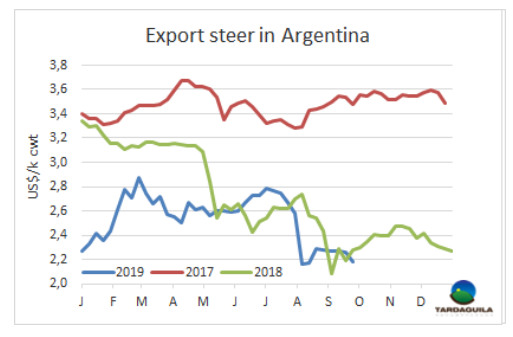 新廠被授權(quán)準入中國使南方共同市場對中國牛肉出口凈重每月至少增長4萬噸。中國授權(quán)準入17家巴西新廠,8家阿根廷新廠,1家烏拉圭新廠,現(xiàn)在主要的局限是冷凍能力。這也是之前為了在未來幾個月內(nèi)增加對中國產(chǎn)量進行投資的原因。預計巴西對中國出口量將增加一倍,今年每月直接出口到中國約3萬噸,8月增長至3.7萬噸,對冷凍能力的投資完成后,每月出口將達到7萬噸。其中一部分來自水漂貨市場,另一部分來自目前輸出的其他目的地,如中東,智利。今年截至目前,阿根廷平均每月對中國出口2.9萬-3萬噸,新工廠被授權(quán)后可達4萬噸,也需要投資改善冷凍條件。烏拉圭工廠屬于中小型,考慮到其持股人是中國公司,也可以供一些量。2019年前八個月南方共同市場對中國平均每月出口約7.5萬噸,冷凍條件的投資一旦完成,加上準入的新工廠,每月出口量將攀升至11萬-12萬噸,占出口總量的55%-57%。