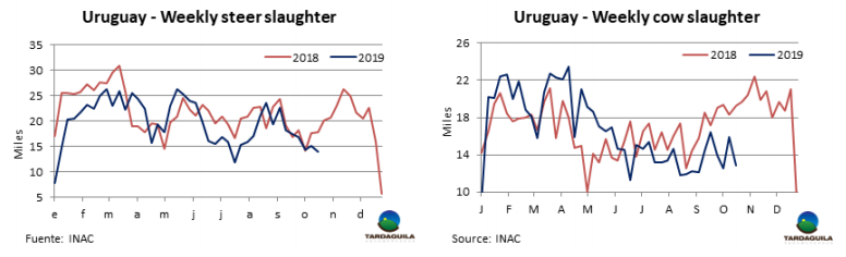 上周牛屠宰量減少是由于草飼牛只短缺和降水引起的裝運(yùn)困難。烏拉圭肉協(xié)報(bào)道,10月19日,被批準(zhǔn)的加工廠牛只屠宰量總計(jì)33398頭,比上周減少3379頭,減少了9.2%,比去年同期減少10000頭。在周對(duì)比中,母牛屠宰量減少3000頭,減少至12906頭。閹牛屠宰量減少1100頭,幼母牛屠宰量增加818頭,增加至5724頭。屠宰量最大的廠是 Minerv-PUL(3779頭),Las Piedras(3114頭),Marfrig-Colonia(2984頭)。Marfrig四家工廠自前一周起共屠宰10478頭牛,Minerva僅PUL一家廠進(jìn)行屠宰活動(dòng)。10月截至目前,牛只屠宰量96137頭,比去年同期減少22.8%,考慮到上周因降水造成的延誤,本周屠宰量將有增長(zhǎng)。但無(wú)論如何10月屠宰量與2018年的20.1萬(wàn)頭相比將減少3.6-3.8萬(wàn)頭。這將是2013年以來10月份的最低水平。