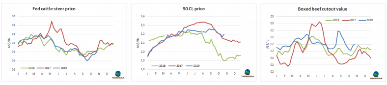 雖然不能肯定世界上主要牛肉出口國(guó)的牛的生產(chǎn)周期均同步,但其中大多數(shù)國(guó)家的牛存欄已經(jīng)停止增長(zhǎng)或開始下降。在南方共同市場(chǎng)國(guó)家中,2018年巴西、巴拉圭、烏拉圭牛只存欄減少,只有阿根廷存欄增加??傮w,與去年相比減少163萬(wàn)頭,減少了0.6%,減少至2.923億頭。據(jù)統(tǒng)計(jì),巴西牛只存欄2.135億頭,2018年是連續(xù)第二年存欄減少,比上年減少1.7%。烏拉圭去年牛只存欄也是連續(xù)第二年減少,2019年減少趨勢(shì)繼續(xù)。巴拉圭牛只減少32萬(wàn)頭,減少至1350萬(wàn)頭,2019年第一季度有一定數(shù)量的恢復(fù)。阿根廷盡管2019-2020存欄計(jì)算年剛過去一半,預(yù)計(jì)母牛和幼母牛數(shù)量減少1.5%-2%,這可能被閹牛、小公牛、牛犢數(shù)量的增長(zhǎng)抵消因此到明年三月總存欄將與2019年同時(shí)期數(shù)量相當(dāng)。2017-2018年阿根廷牛只存欄增長(zhǎng)57.5萬(wàn)頭,增長(zhǎng)至5990萬(wàn)頭。其他牛肉出口大國(guó)情況類似,美國(guó)7月1日牛只存欄不景氣,1.03億頭,母牛和牛犢數(shù)量穩(wěn)定。歐盟牛只從2017年的8915萬(wàn)頭減少至2019年的8750萬(wàn)頭,減少了1.85%。澳大利亞受干旱的嚴(yán)重影響,今年牛只存欄減少3.8%,預(yù)計(jì)明年存欄2450萬(wàn)頭,達(dá)31年來最低,2020年斷奶牛犢數(shù)量將減少至1985年來最低。總的來說,從世界上主要的牛肉出口地區(qū)來看,以產(chǎn)量的增長(zhǎng)來彌補(bǔ)由于非洲豬瘟在中國(guó)和其他亞洲國(guó)家的流行而導(dǎo)致的需求增長(zhǎng)是不可能的。