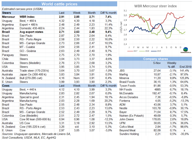 巴西育成閹牛價(jià)格的強(qiáng)勢(shì)增長(zhǎng)趨勢(shì)對(duì)南方共同市場(chǎng)有很大影響,本周世界牛肉周報(bào)南方閹牛胴體價(jià)格增長(zhǎng)6美分,增長(zhǎng)至2.91美元/公斤。兩個(gè)月來(lái)價(jià)格增長(zhǎng)了30美分,增長(zhǎng)了11.5%。上漲的多方面原因中最主要一個(gè)是巴西。本周在巴西主要的出口州育成公牛平均價(jià)格增長(zhǎng)8美分,增長(zhǎng)至2.71美元/公斤,主要影響因素是出口需求強(qiáng)勢(shì),國(guó)內(nèi)市場(chǎng)月初消費(fèi)增加。阿根廷本周的高價(jià)位保持在上周末大選后的水平,情況很不尋常,老母牛的價(jià)格和閹牛價(jià)格相當(dāng)。烏拉圭和巴拉圭的市場(chǎng)參考價(jià)本周分別增長(zhǎng)5美分和2美分,烏拉圭價(jià)格增長(zhǎng)至4.32美元/公斤,巴拉圭價(jià)格增長(zhǎng)至2.75美元/公斤。巴西