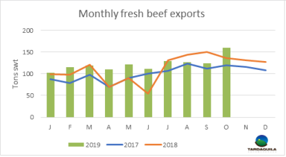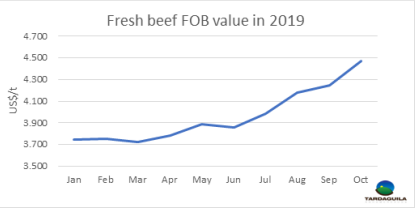 中國(guó)市場(chǎng)的更好機(jī)會(huì)使冷凍牛肉到歐洲市場(chǎng)出口量減少至本世紀(jì)初口蹄疫危機(jī)后最低水平。根據(jù)海關(guān)出口數(shù)據(jù),10月冷凍牛肉到歐洲出口量?jī)H323噸,今年截至10月,出口量總計(jì)7796噸,比2018年同期減少44%。另一方面,冷鮮牛肉出口至歐洲共1044噸,因?yàn)樯蟼€(gè)月481配額范圍內(nèi)的發(fā)貨量幾乎為零。今年截至目前冷凍牛肉和冷鮮牛肉出口至歐洲量減少21%,減少至2.8萬(wàn)噸。