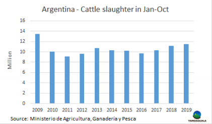 根據(jù)國(guó)家農(nóng)業(yè)貿(mào)易控制局的數(shù)據(jù),2019年10月牛屠宰量130萬(wàn)頭,2019年前10個(gè)月總屠宰量達(dá)1140萬(wàn)頭,這也是自2009年以來(lái)同期最大。SWIFT以439,232頭在全國(guó)屠宰排名中保持領(lǐng)先,緊隨其后的是Rioplatense(328,405只),Coto Santa Fe(257,388只),ArreBeef(251,689只)和Gorina(246,786只)。