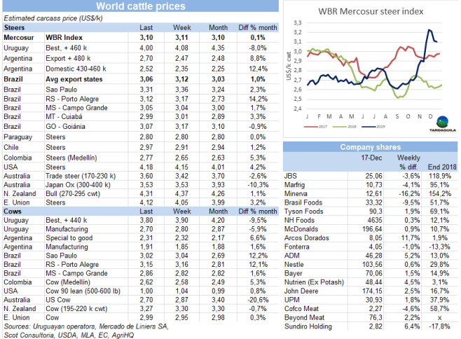 巴西和烏拉圭繼續(xù)壓低當(dāng)?shù)赜膳r(jià)格,而阿根廷稅率的變化抬高了閹牛出口價(jià)格。因此,南方共同市場(chǎng)閹牛價(jià)格指數(shù)下降1美分,胴體價(jià)格下降至3.1美元/公斤。巴西本周凈差額再次下降,盡管近幾天顯示出穩(wěn)定趨勢(shì),本周雷亞爾升值2%不足以扭轉(zhuǎn)育成牛價(jià)格的下跌,價(jià)格按美元計(jì)下跌6美分,胴體價(jià)格下降至3.06美元/公斤。烏拉圭閹牛價(jià)格持續(xù)下跌,報(bào)價(jià)4美元/公斤,并將繼續(xù)下跌。阿根廷出口閹牛比索價(jià)格在穩(wěn)定了幾周之后本周開(kāi)始上漲。我們必須考慮到稅率上漲使出口同等數(shù)量的肉變得更加昂貴。本周參考價(jià)格指數(shù)上漲23美分,胴體價(jià)格上漲至2.7美元/公斤。巴拉圭育成牛胴體價(jià)格連續(xù)第五周保持2.8美元/公斤。