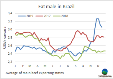 本周在巴西主要的活牛交易市場(chǎng)育成牛價(jià)格再次出現(xiàn)下行,近幾日有穩(wěn)定跡象,有些地區(qū)甚至出現(xiàn)上行修正。牛只供應(yīng)有限,需求也是一樣,預(yù)計(jì)接下來(lái)幾天會(huì)繼續(xù)縮減,因?yàn)橐恍┕S在今年年末和2020年年初停止屠宰活動(dòng)。圣保羅期貨市場(chǎng)第一批期貨(12月到2月)價(jià)格上漲,尤其是12月的合同價(jià)格上漲了6.6雷亞爾/15公斤,2020年年中以后仍然呈下行趨勢(shì)。批發(fā)市場(chǎng)牛肉價(jià)格繼續(xù)下跌。
