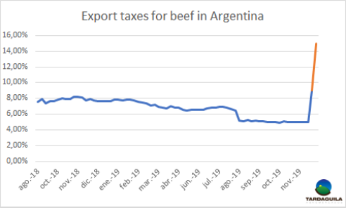 上任一周以來(lái),宣布一系列聲明后,基什內(nèi)爾政府阿爾貝托·費(fèi)爾南德斯希望國(guó)會(huì)今天批準(zhǔn)《經(jīng)濟(jì)緊急狀態(tài)法》草案,該草案于昨日在議會(huì)上提交,將賦予他非凡的權(quán)力,在許多微妙的問(wèn)題上避免立法的干預(yù)。此前,上周六發(fā)布了一項(xiàng)法令通過(guò)更改百分比,修改了前任政府2018年9月恢復(fù)出口加征關(guān)稅的規(guī)則,以前每出口1美元征收一定數(shù)量阿根廷比索的稅。(每出口1美元牛肉征收3阿根廷比索)。整體性的規(guī)則還未明確,大致分析的結(jié)果是牛肉的有效出口稅被定在9%,比15個(gè)月前打算加征的8%高1個(gè)百分點(diǎn),考慮到比索貶值的影響,出口稅的數(shù)額比上周增長(zhǎng)了4.2個(gè)百分點(diǎn)。該措施導(dǎo)致大豆出口稅率達(dá)30%,糧食和其他油籽稅率為12%。昨天,所有這些推理都變得抽象,因?yàn)樵谡M裉飓@得批準(zhǔn)的經(jīng)濟(jì)緊急措施系列計(jì)劃中,對(duì)大豆的出口稅改為了33%,對(duì)2018年9月2日(馬克里重新征收出口稅之前)沒(méi)有涉及的產(chǎn)品,例如小麥,玉米和牛肉征收出口稅15%。根據(jù)當(dāng)前的閹牛出口價(jià)格,按照稅率增長(zhǎng)9%計(jì)算,每公斤胴體將被征收額外的17美分,如果稅率變?yōu)?span>15%,進(jìn)口稅將增長(zhǎng)約38美分。