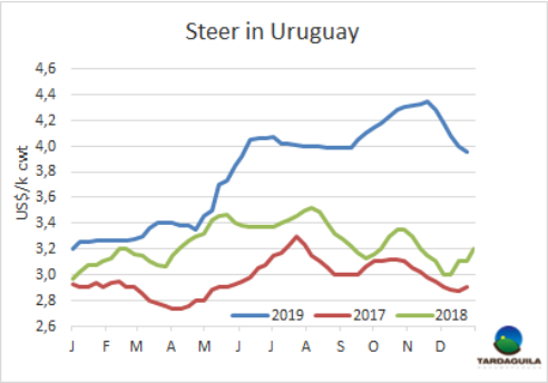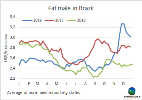 烏拉圭工廠也關注到中國市場的下行。巴西現在開始將部分出口供應轉向巴拉圭的關鍵市場,如智利和俄羅斯。智利圣地亞哥1月裝船的巴拉圭全牛20件套5300美元/噸,俄羅斯市場肩胛背肩上周從4100美元/噸下降到3800每元/噸。據一位業(yè)內人士稱,后部位肉巴拉圭工廠售價不超過4300美元/噸,“競爭不容易,現在我們還要與活牛價格走低的巴西競爭。”