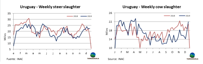 上周巴西牛肉價格和活牛價格均表現穩(wěn)定,圣保羅育成牛價格30天內參考價格穩(wěn)定在202雷亞爾/15公斤,一些地區(qū)表現出下行的周修正趨勢,另一些地區(qū)則有上漲。盡管像JBS上周宣布的那樣,今年年末和明年年初屠宰活動頻繁的工廠將減少,活牛價格依然保持穩(wěn)定。本周期貨市場價格有下行趨勢,12月合同育成牛價格高于當前參考價。上周批發(fā)市場牛肉價格穩(wěn)定,后部位肉需求松動,與11月末達到的最高價相比,后部位肉下跌20%,前部位肉價格下跌14%。烏拉圭