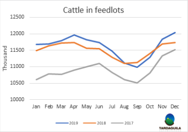 2019年12月1日,美國屠宰市場存欄能力1000頭及以上的飼育場牛只存欄總計約1200萬頭,比2018年12月1日增長2%。11月補欄209萬頭,比2018年增長5%,凈增203萬頭。11月出欄總量181萬頭,比2018年減少3%,11月掉頭數量6.5萬頭,比2018年減少了19%。
