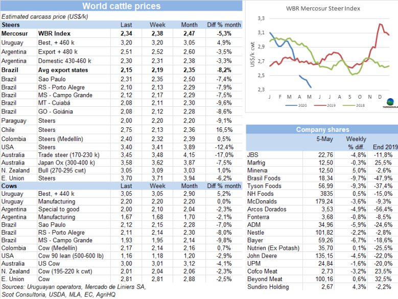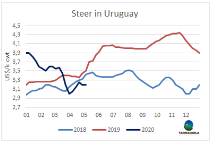 由于牛只供應(yīng)的短缺和新冠肺炎影響下屠宰活動減少,4月牛只屠宰量同比減少了35%,至137478頭,較上年減少7.3萬頭。盡管每月最后兩周屠宰量會增長,但與2019年第四個月的差距是今年以來最大的。截止5月3日的一周,工廠收了36122頭牛進行屠宰,周屠宰量較上周減少了10%,減少約4000頭,較去年同一周減少了15%。閹牛屠宰量降幅最低,降低了7.2%,至15892頭,母牛屠宰量降低了11.7%,至15283頭,小母牛屠宰量降低了12.7%,至4141頭。屠宰量最大的工廠是 Marfrig-Tacuarembó (3561頭),Las piedras(3550頭), Carrasco (3078頭).Marfrig四家工廠屠宰總量10851頭,美麗華兩家工廠屠宰總量4746頭。今年前四個月烏拉圭牛只屠宰總量601864頭,較2019年同時期減少了23.6萬頭,減少了28.2%。