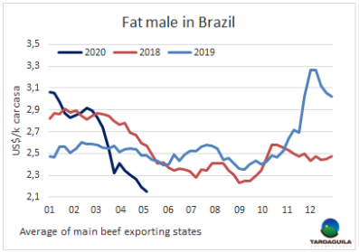 自疫情開始襲擊南美地區(qū)以來,南方共同市場閹牛平均價格保持下行趨勢。本周閹牛價格2.34美元/公斤,較上周下跌4美分,較2月末下跌64美分,下跌了21.5%。本周巴西貨幣貶值仍然是主導(dǎo)因素,疫情對巴西政治和公共衛(wèi)生方面的影響導(dǎo)致其貨幣再次貶值1.5%,較2月末貶值27.4%。巴拉圭活牛價格下跌也拉低了該地區(qū)閹牛價格指數(shù),巴拉圭待宰活牛價格本周下跌20美分,下跌至2美元/公斤。阿根廷和烏拉圭本周參考價格保持穩(wěn)定。