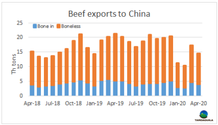 由于歐洲需求銳減,日本成為烏拉圭4月份出口冷凍牛肉的主要目的地。4月烏拉圭至日本牛肉出口量14.7噸,平均出口離岸價9203美元/噸。日本成為最大出口目的地不是由于到日本出口量上漲,而是由于到其他市場出口量下降,主要是歐洲。2019年10月至2020年1月期間,冰鮮牛肉至日本平均發(fā)船量200噸/月,2020年2月至4月,縮減至150噸/月。