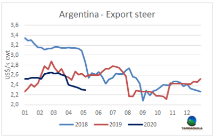 雖然在隔離令開始時,阿根廷國內(nèi)市場的牛肉消費出現(xiàn)反彈,但隨著實行社會補貼,最初的熱情逐漸消退。一位市場專家指出,這些天來,恐慌累積導(dǎo)致許多產(chǎn)品的需求下降,原因是家庭預(yù)算問題,信用卡的使用時間縮短到月底。牛肉是受到影響的一種商品,價格與國外市場相比很低,本地也沒有其他的食物的競爭,這反映出供應(yīng)多而價格下跌。此外閹牛的需求端出現(xiàn)問題,國內(nèi)需求僅能消費牛肉產(chǎn)量的四分之三。