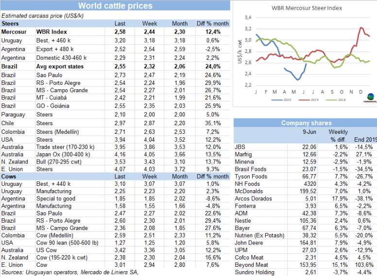 本周南方共同市場(chǎng)閹牛價(jià)格急劇上漲,達(dá)到三月中旬疫情剛剛開(kāi)始在南美地區(qū)蔓延時(shí)的價(jià)格水平。本周南方共同市場(chǎng)閹牛價(jià)格上漲14美分,上漲至2.58美元/公斤。巴西活牛價(jià)格上漲是主導(dǎo)因素,但巴西不是牛價(jià)上漲唯一的原因。本周雷亞爾增值6.7%,較5月中增值17%。經(jīng)濟(jì)危機(jī)期間通貨膨脹急劇下降,給貨幣當(dāng)局大幅降低市場(chǎng)基準(zhǔn)利率的空間。巴西主要出口州育成牛價(jià)格上漲了5.3雷亞爾/15公斤,上漲至187.1雷亞爾/15公斤,達(dá)3月末以來(lái)最高。巴拉圭牛價(jià)在連續(xù)5周穩(wěn)定之后也有上漲,烏拉圭市場(chǎng)堅(jiān)挺,只有阿根廷牛價(jià)受匯率變化的影響有所下跌,但出口閹牛價(jià)格穩(wěn)定在160比索/公斤。