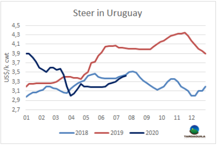 歐盟昨日宣布的大規(guī)模經(jīng)濟(jì)刺激計(jì)劃,以及新冠肺炎疫苗研制進(jìn)展的利好消息,帶動(dòng)了市場(chǎng)的樂觀情緒,推高了主要股指,新興國(guó)家貨幣也有升值。昨天巴西雷亞爾增值2.4%,較一周前增值3%,促進(jìn)牛價(jià)堅(jiān)挺。巴西主要出口州育成牛雷亞爾平均價(jià)格上漲了0.7%,美元價(jià)格上漲0.9美分,上漲至2.62美元/公斤。巴拉圭和烏拉圭牛價(jià)保持冬季一直以來的上行趨勢(shì)。巴拉圭閹牛報(bào)價(jià)2.45美元/噸,烏拉圭牛價(jià)要高出1美元,3.43美元/噸。阿根廷出口閹牛比索價(jià)格與上周保持不變,由于比索官方匯率珠江下跌,美元價(jià)格下跌2美分至2.81美元/公斤。南方共同市場(chǎng)活牛價(jià)格指數(shù)本周上漲5美分,上漲至2.74美元/公斤。