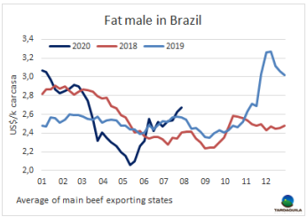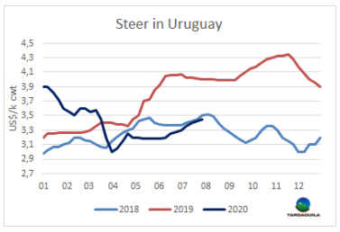本周南美國(guó)家待宰牛價(jià)格上漲,上漲趨勢(shì)受到密切關(guān)注。南方共同市場(chǎng)閹牛價(jià)格指數(shù)上漲4美分,至2.78美元/公斤,達(dá)三月上半月新冠疫情在南美地區(qū)爆發(fā)以來新高。較五月中旬牛價(jià)低點(diǎn)時(shí)上漲了48美分,上漲了21%。巴西,按本地雷亞爾計(jì)的成交價(jià)再次上漲。本周美元在全國(guó)范圍內(nèi)下跌,而巴西雷亞爾升值1.2%。巴西主要出口周育成牛價(jià)格上漲5美分,上漲至2.67美元/公斤。巴拉圭由于在口蹄疫接種階段活牛供應(yīng)量少,價(jià)格保持上漲趨勢(shì)。阿根廷和烏拉圭活牛參考價(jià)本周上漲2美分,分別上漲至2.83美元/公斤和3.45美元/公斤。烏拉圭目前已經(jīng)看到價(jià)格上漲趨勢(shì)將在本季度后停止。