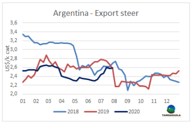 美國(guó)市場(chǎng)已成為阿根廷在中國(guó)市場(chǎng)低迷時(shí)期的補(bǔ)救措施:今年6月,阿根廷對(duì)美國(guó)胬肉銷售量達(dá)到2196噸,較5月增長(zhǎng)308%,占美國(guó)年度總配額20000噸的10%以上。六月對(duì)美國(guó)出口的冰鮮牛肉平均價(jià)格6131美元/噸,冷凍牛肉平均價(jià)格4201美元/噸。因此,6月成為自2018年底恢復(fù)對(duì)美出口以來銷量最好的一個(gè)月。2020年至今,阿根廷已經(jīng)向美國(guó)出口牛肉6440噸,出口額超3300萬美元。