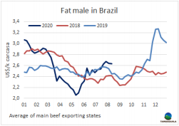 受巴拉圭和烏拉圭牛價下跌以及巴西雷亞爾匯率疲軟的影響,本周南方共同市場閹牛價格指數(shù)下跌1美分,下跌至2.75美元/公斤。巴西方面在基準(zhǔn)利率Selic再次下調(diào)至2%的歷史新低后,美元在一周內(nèi)上漲了2%。此外有跡象表明,牛價還將進(jìn)一步下跌。雷亞爾的疲軟掩蓋了以當(dāng)?shù)刎泿庞嬎愕挠膳r格上漲,最后,以美元計的價格仍保持在2.64美元/噸不變。烏拉圭方面牛價保持急劇下跌的趨勢,出口閹牛成交價最高3.4美元/公斤,較上周下跌3美分。南美地區(qū)唯一一個育成牛價格上漲的國家是阿根廷,上漲了3美分,出口閹牛價格上漲至2.87美元/公斤,包含出口稅。