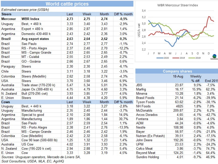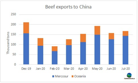 截止今年7月,南方共同市場(chǎng)的牛肉消費(fèi)量下降了42萬(wàn)噸,部分原因是產(chǎn)量下降,加上出口競(jìng)爭(zhēng)力較疲軟的國(guó)內(nèi)市場(chǎng)有所提高。巴西、巴拉圭和烏拉圭牛肉消費(fèi)量顯著下降,阿根廷牛肉消費(fèi)量相對(duì)穩(wěn)定。相對(duì)權(quán)重最大的市場(chǎng)是巴西,雷亞爾貶值使出口競(jìng)爭(zhēng)力提高,新冠疫情危機(jī)對(duì)巴西購(gòu)買力的也產(chǎn)生影響,與2019年前7個(gè)月相比,國(guó)內(nèi)消費(fèi)下降了40多萬(wàn)噸。按百分比計(jì)算,消費(fèi)下降更劇烈的是烏拉圭,產(chǎn)量的急劇下降被進(jìn)口的增加部分抵消。預(yù)計(jì)這一趨勢(shì)將在未來(lái)幾個(gè)月持續(xù)下去,因?yàn)閲?guó)內(nèi)需求沒(méi)有改善跡象,而這可能開(kāi)始改變目前部分出口量的去向。